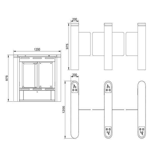 | Technical Parameters | ◆Chassis Material: Austenitic stainless steel SUS304 ◆Internal Structure: Steel Frame Construction/Standard Stainless Steel Housing ◆Work Voltage: AC220V±10V ◆Driving Motor: DC brushless motor(24~36VDC) ◆Movement Structure: Horizontal helical gear anti-collision movement ◆Normal Work Life: Continuous opening and closing for more than 5 million times ◆Infrared Sensors: 4 pairs; 8 pairs can be selected ◆Working Environment Temperature: -35℃~75℃ ◆Relative Humidity: 0~90% (No condensation) ◆Communication Interface: RS232 serial port ◆Communication Protocol: MODBUS protocol ◆Working Speed of the Gate: ≤30 persons/min (The memory mode can be turned on) ◆Passing Time: passing time by swiping card: 10S (If no one passes within 10S: the gate will automatically close, and the time can be adjusted according to needs) | |||